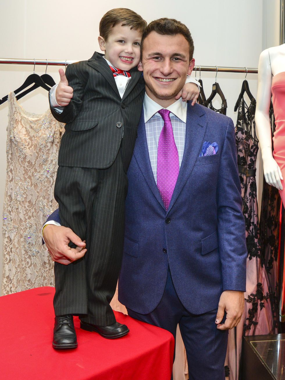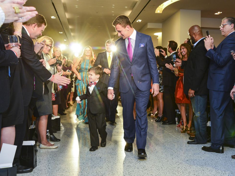 Bad boy Johnny Manziel's halo was in full view Tuesday night when the former Texas A&M quarterback flew in from training in San Diego to run a Houston catwalk that traversed a gauntlet of social swells on behalf of a young cancer survivor.