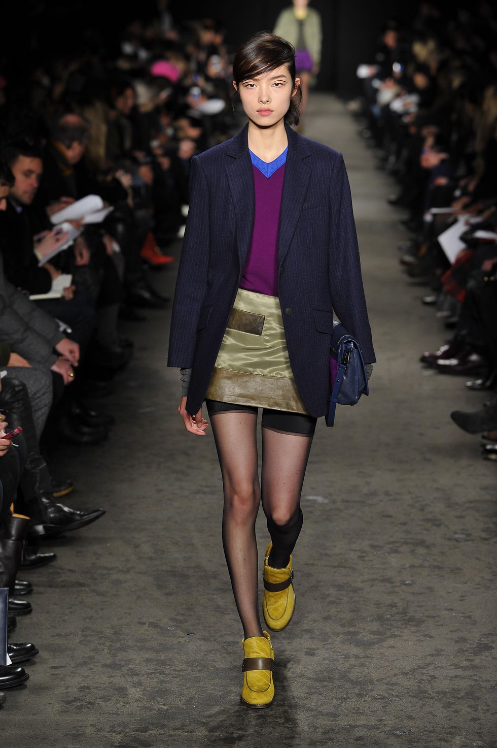 At times, the collection feels like a peek into your boyfriend's closet, with houndstooth sweaters, oversized pea coats, haircalf loafers (updated in bright shades of royal blue, mustard and grape) and crisp blazers.