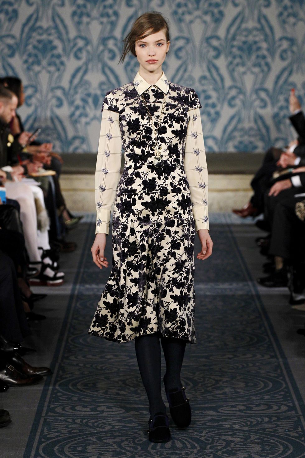 Burch completed the collection with a series of dresses and coats in a navy and white velvet rose jacquard. She liked it so much she wore a V-neck dress in the eye-catching pattern when she made her runway bow.