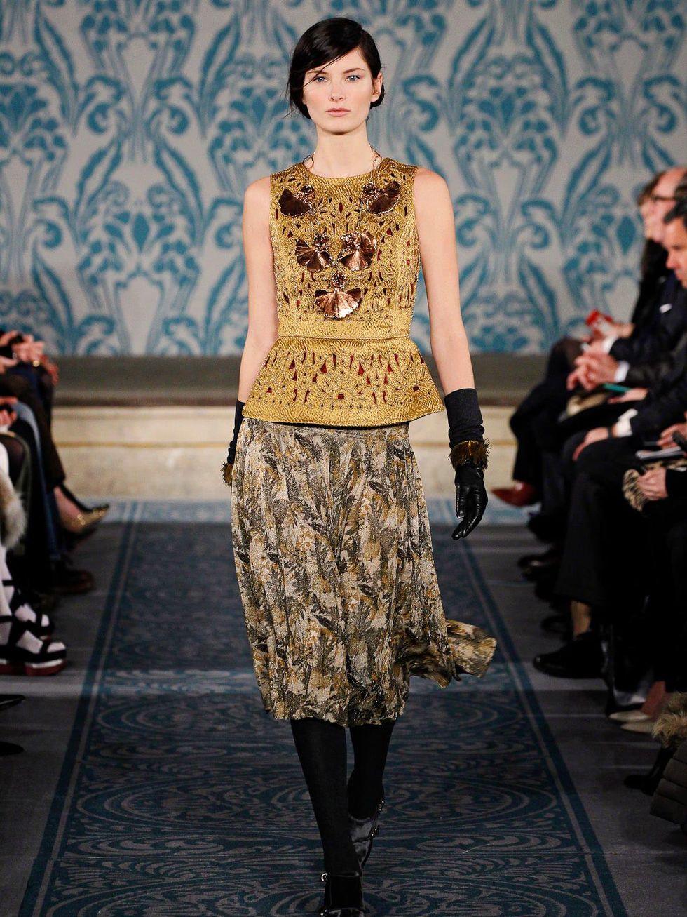 From the opening look — a beaded tweed coat and taffeta dress in shiny zigzag patterns — to the last — a satin georgette gown with shiny gold sequined Peter Pan — nearly every piece in the collection glimmered in the ornate surroundings of the Pierre Hotel ballroom.