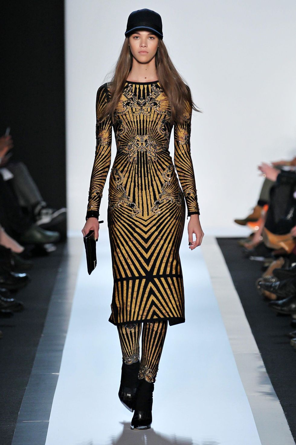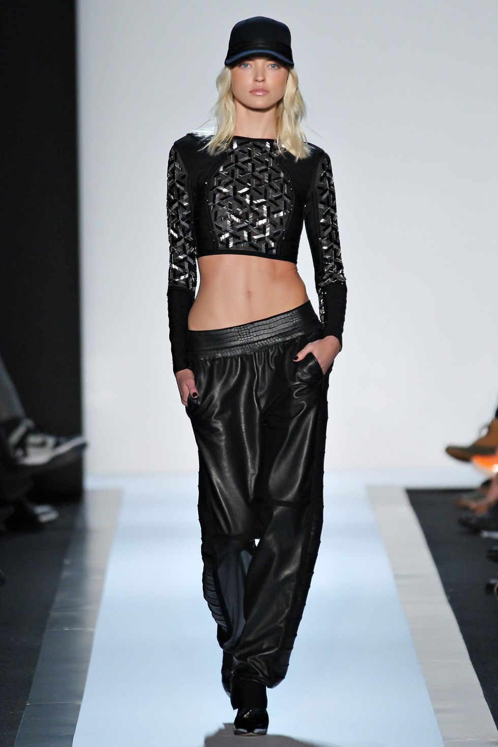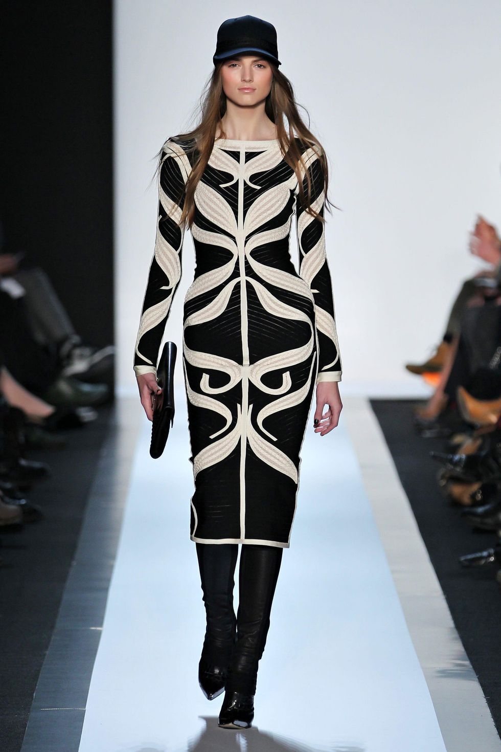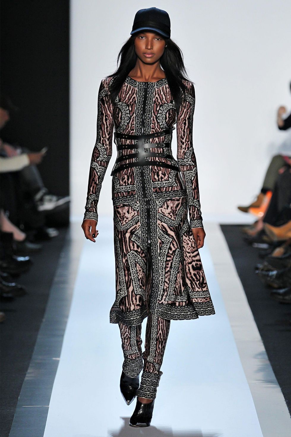 Herve Leger gunmetal ocelot jacquard bandage crop top, zip-front skirt and bandage leggings, with black croco leather ankle-cuff bootie, black cap with bandage detail and clutch.