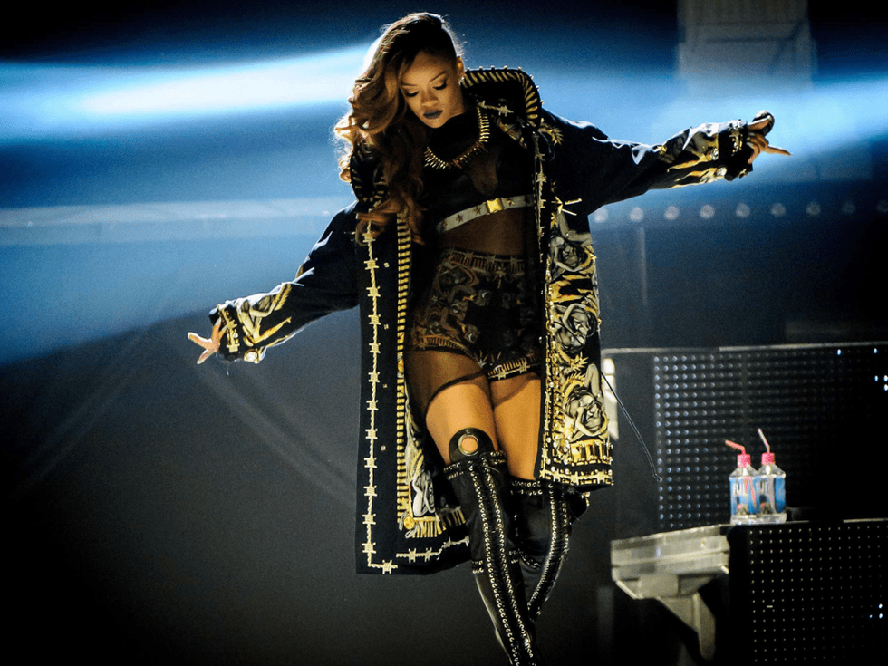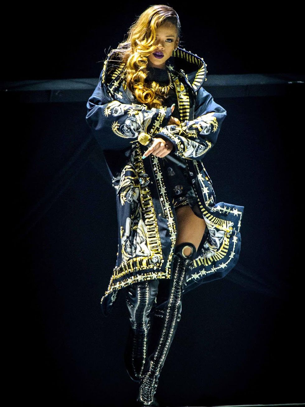 For the opening act of Rihanna's World Diamonds Tour, Givenchy's Riccardo Tisci designed a black and white nappa leather bra with gold star embroidery and gold buckles.