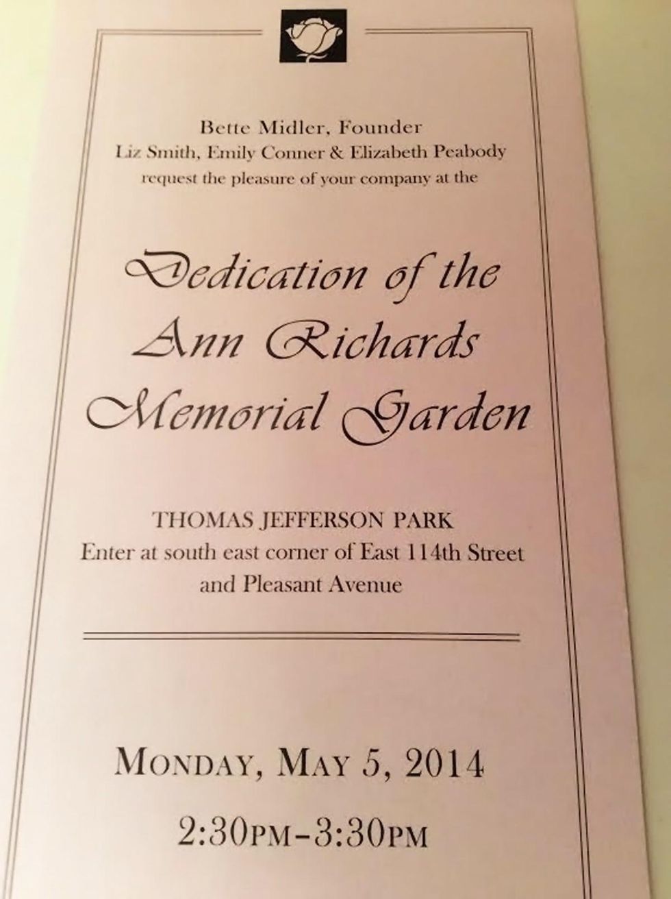 Among the heavyweights who helped finance the initial stage of the Ann Richards Memorial Garden in Thomas Jefferson Park were Hillary and Bill Clinton, former New York Mayor Michael Bloomberg, Lily Tomlin and Jane Wagner, Yoko Ono Lennon, and Holland Taylor. You might recall that Taylor wrote and starred in Ann on Broadway. Conner, who co-produced the play, has been instrumental in fundraising for the project from the beginning.