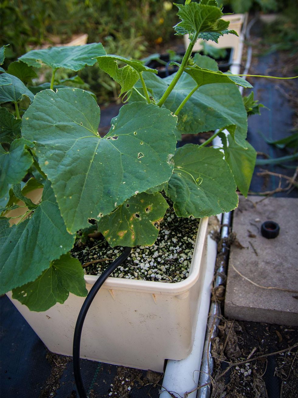 My outdoor experiment was composed of 20 containers known as Dutch buckets, filled with coconut coir and coarse perlite. Each $5 bucket holds about eight quarts of growing medium and drains at the bottom through a half-inch hole.