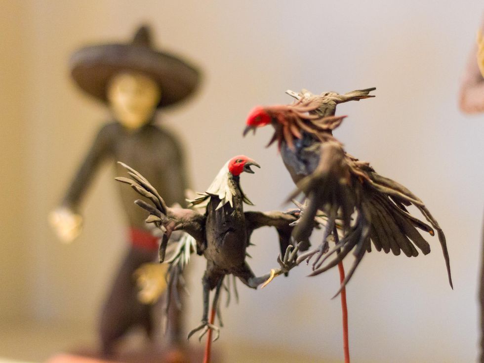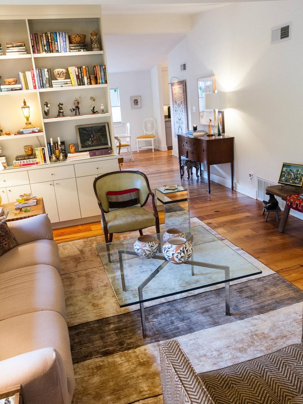 Lenox's love affair with Santa Fe style and art is evident. The room is filled with eclectic finds ranging from a vintage oak pig slaughtering bench to Navajo rugs, Acoma pottery and a Day of the Dead cockfight tableau. A vintage Cassina sofa, scored at a resale shop, is covered in camel hair fabric that had to be sent to HQ in Italy for approval before they'd make a slipcover for it.
