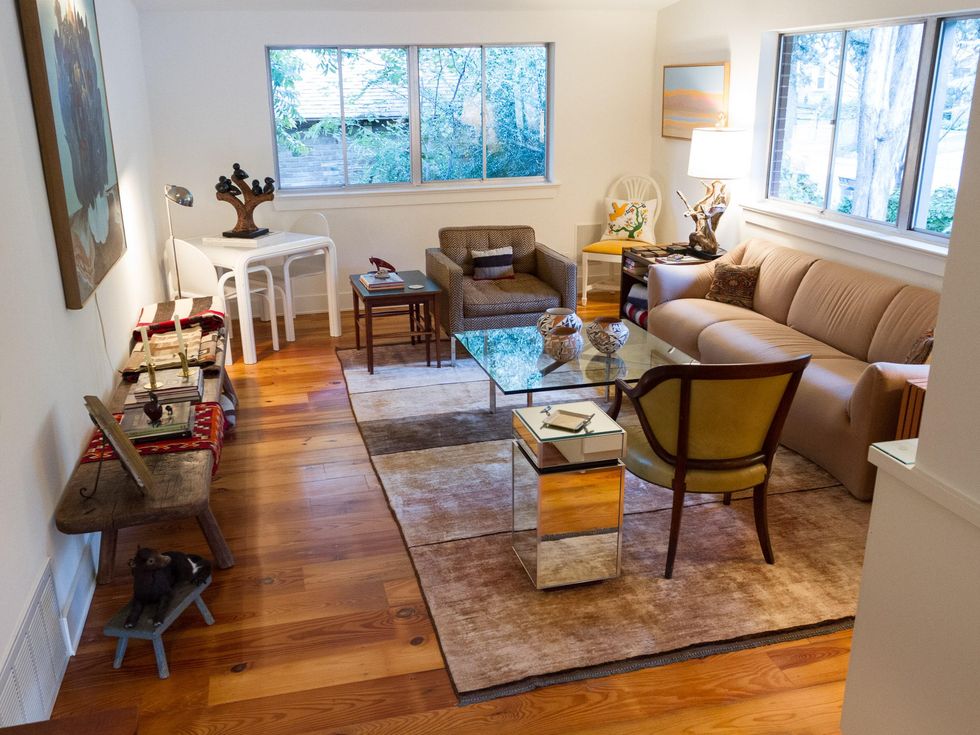 They kept the original windows, which are just big enough to allow a view of the treeline but not so small that the house feels dark. It is in the front room that Lenox feels the most at home — and the most himself.