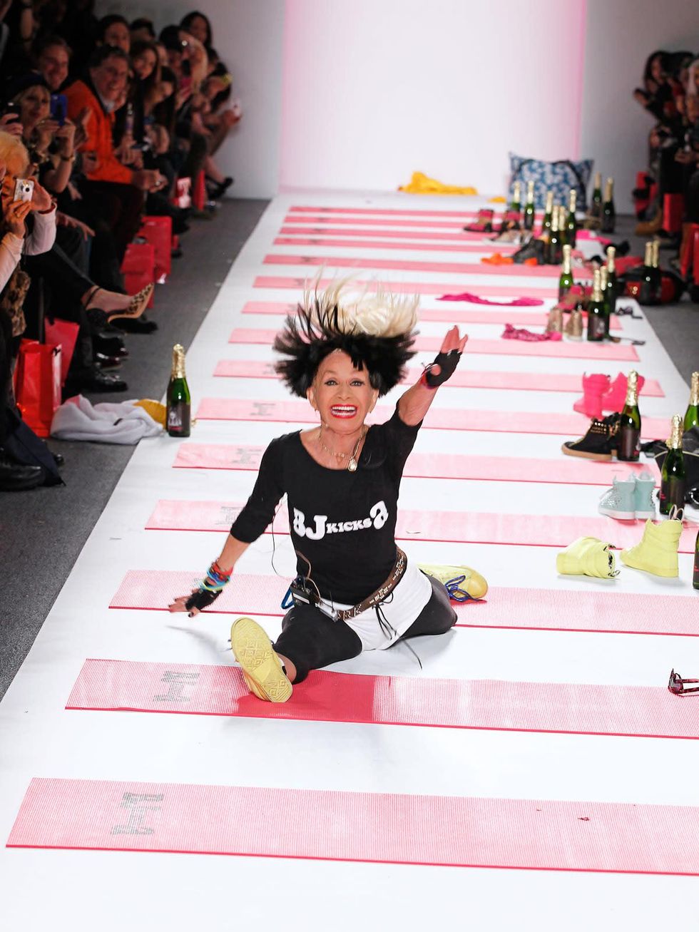 A frenetic ball of energy, 70-year-old Johnson introduced her new line of activewear, called "Betsey kicks A," by leading an exercise class on the runway.