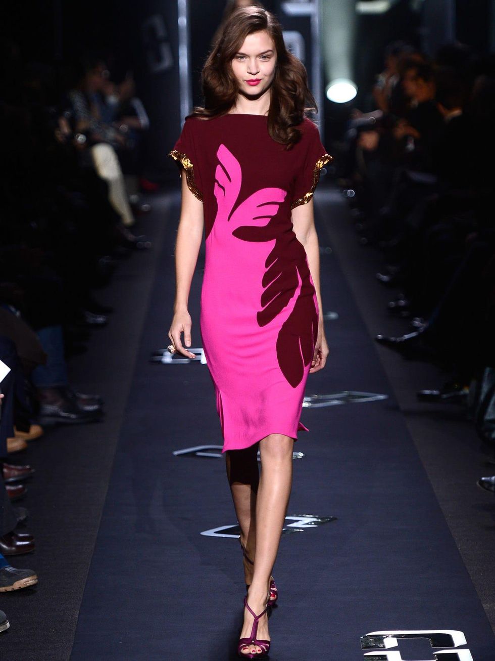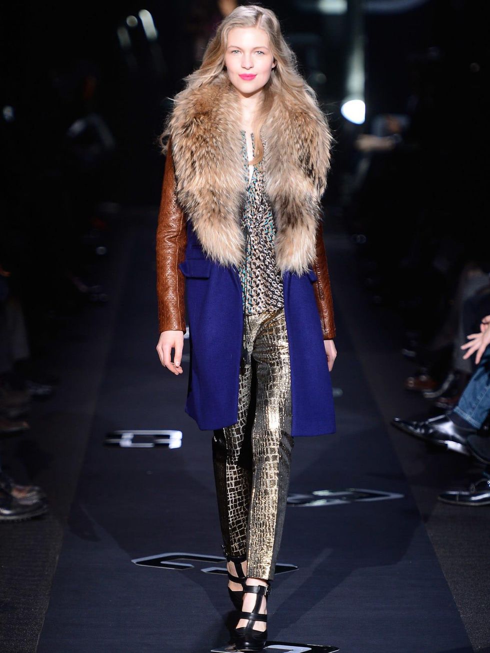 As Donna Summer's "Love to Love You Baby" blared over the sound system, von Furstenberg offered her trademark wrap dress in a variety of styles along with metallic blazers over leopard-print pants, quilted jackets over metallic pants, hot pink suits, print chiffon blouses, velour-like jackets, and dresses in chain-print patterns.