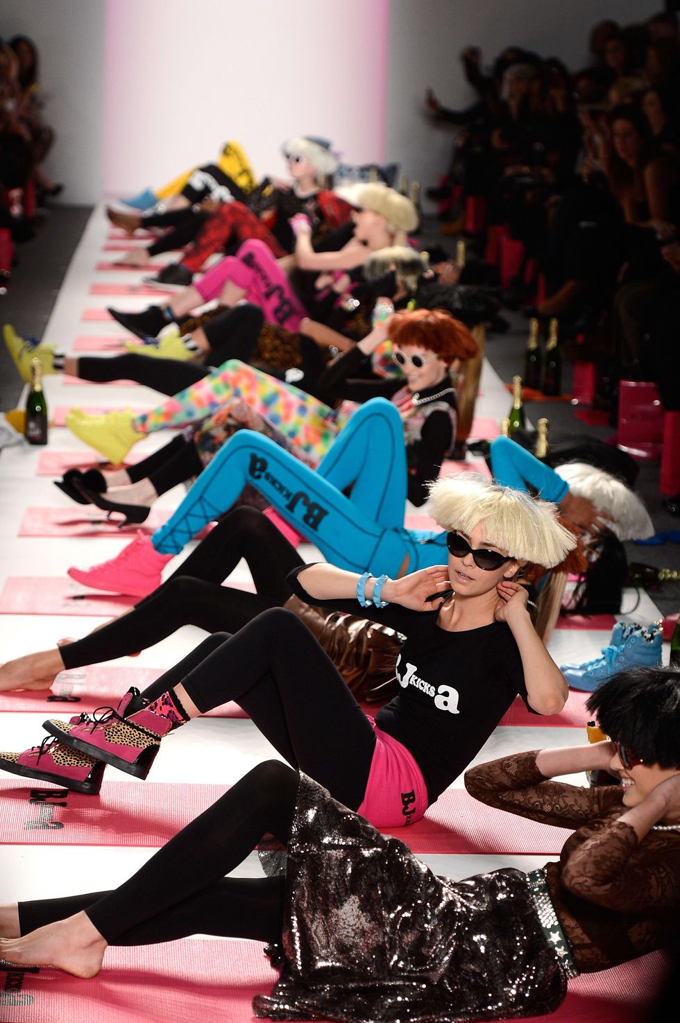 The models doffed outwear — polka-dotted puffy jacket, faux fur vests, black-and-white leather jacket with a red heart on the back (that's considered traditional by Johnson's standards) — to reveal colorful leggings, a neon-colored peplum sweatshirt, and pink and black tutus and animal-print workout wear. Veering away from the prom party dresses that Johnson is known for was probably a smart move to freshen up the line.