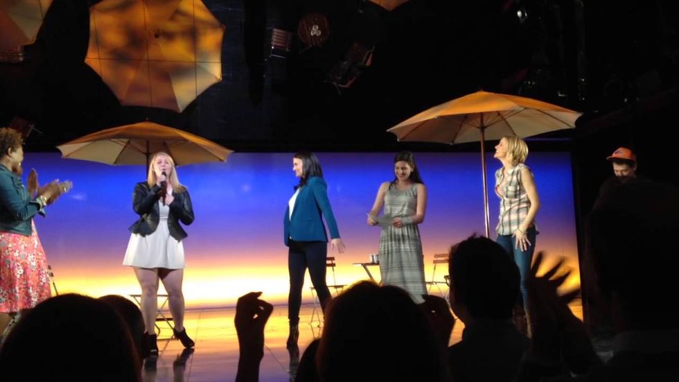 Before I knew it, I was holding a lyric sheet and a microphone and walked onto the stage in front of a Broadway audience, surrounded by a Broadway cast. The whole thing was so surreal that I don't have actual memory of a lot of it. When I watched the video that my sister, Rachel, captured, I saw moments that hadn't even registered when they were happening. Blythe and I kept looking at each other in disbelief. We were sharing a moment that we would remember for the rest of our lives.