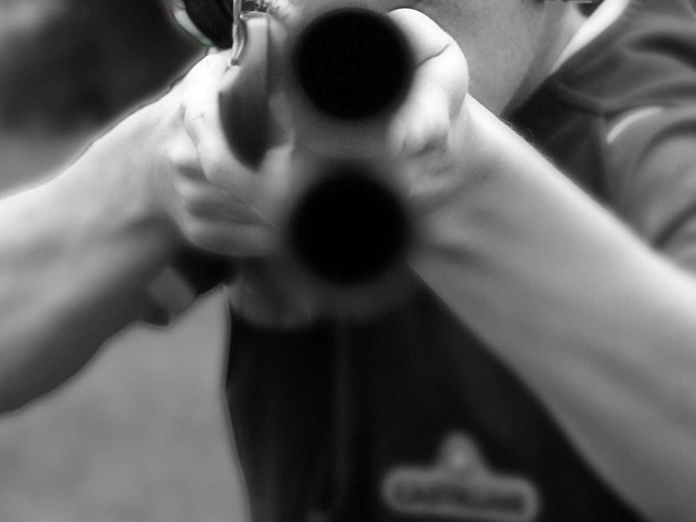 [Puts muzzle to imaginary person’s temple. Click. Click. Click. Click.]