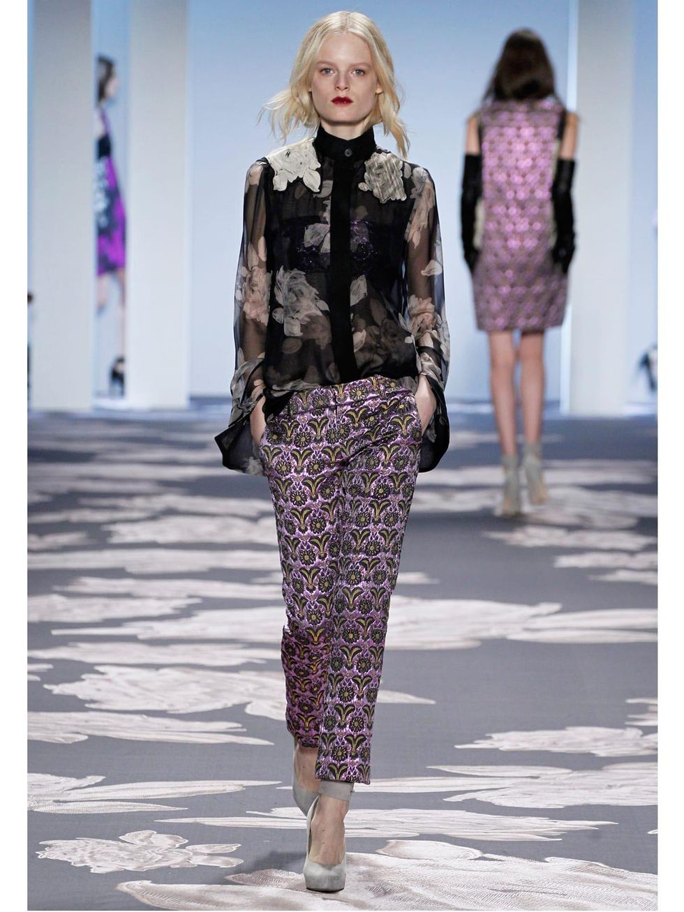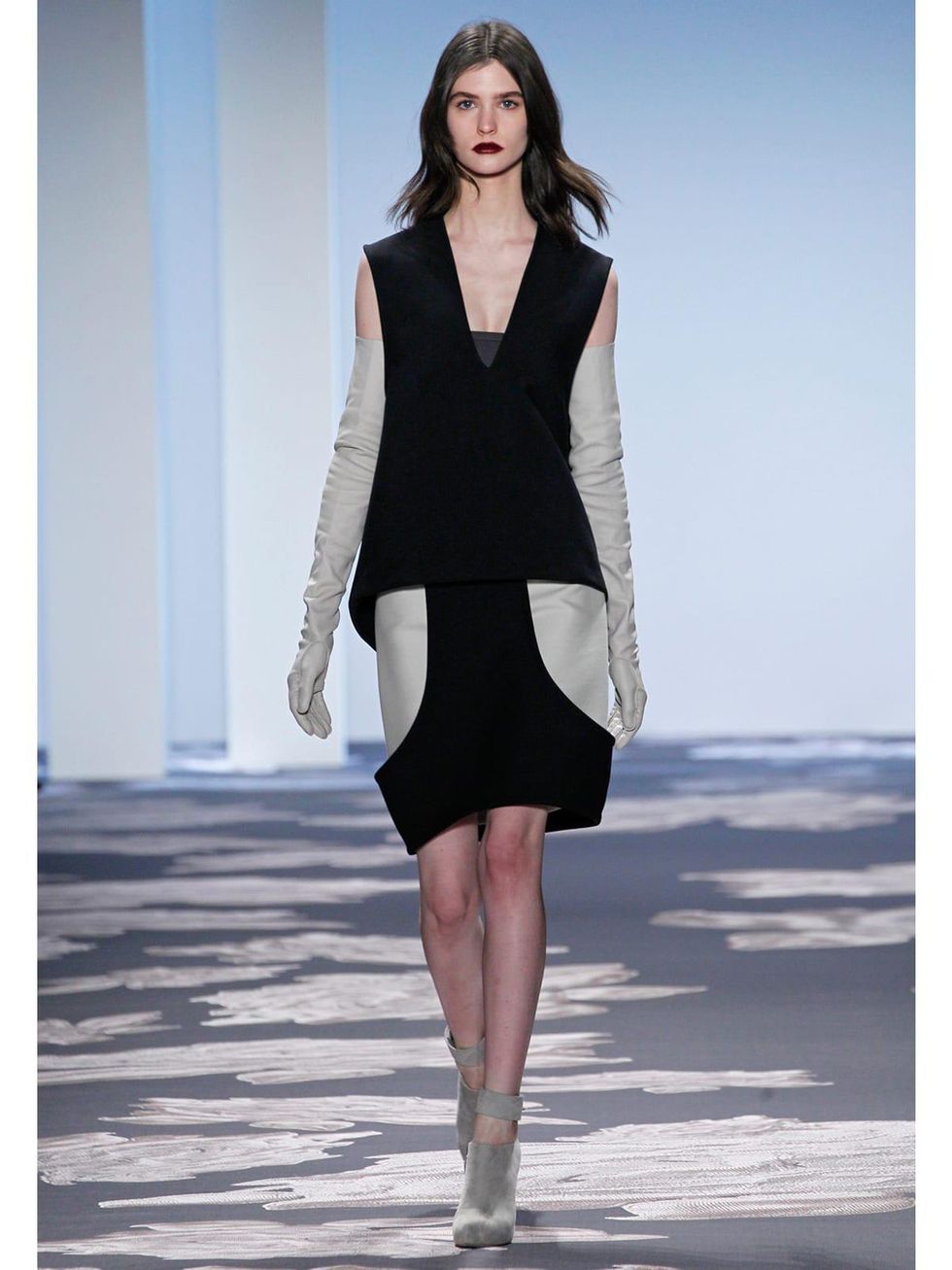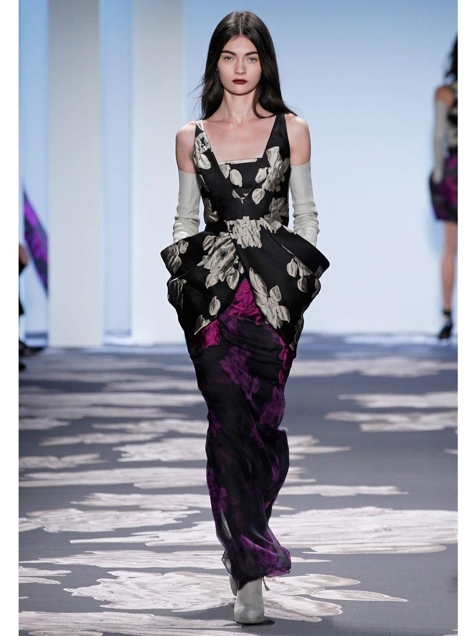 Her latest collection, unveiled before a celebrity-studded audience at Mercedes-Benz Fashion Week, ranged from severe cocoon-shaped creations with exaggerated armholes, voluminous shapes and color-block panels to delicate brocade evening attire that incorporates origami folds, pleated peplums and lace insets.