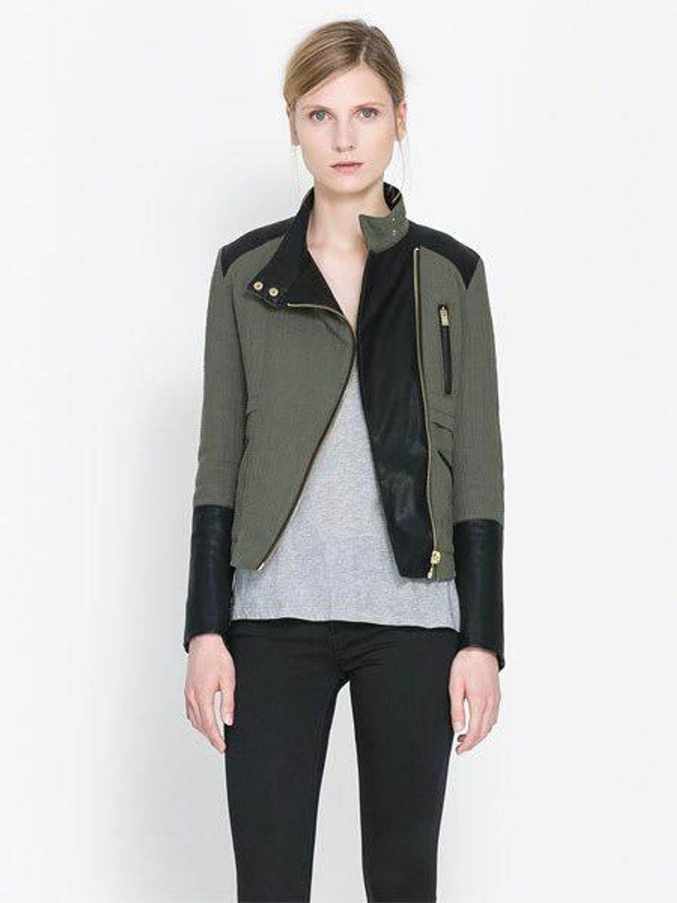 Get two trends in one with this army green moto jacket [https: /mommystylist.com/2013/09/04/fall-trends-for-moms-moto-jackets/]. ($99.90/Zara [https://www.zara.com/us/en/woman/blazers/quilted-crossover-jacket-c269184p1296523.html])
