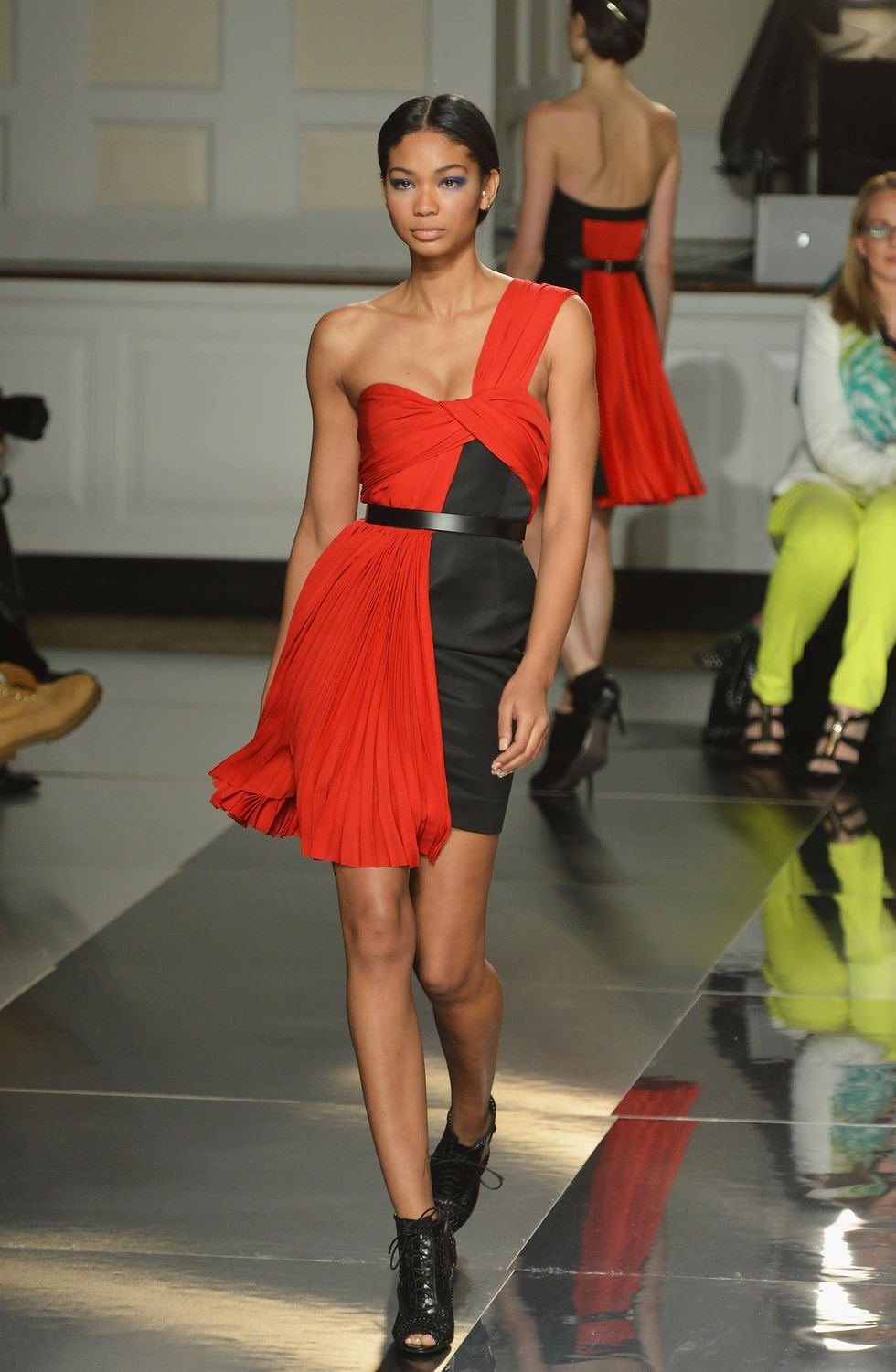 The look: Wu's sophisticated collection, dubbed "Extreme Femininity," includes a range of styles, from satin-and-fur motorcycle jackets belted tight at the waist to frothy ostrich feather party dresses. There is a grown-up-in-a-good-way feeling to the collection, which also includes pleated dresses with beaded trim and a belted peplum top with flowing train and stovepipe pants.