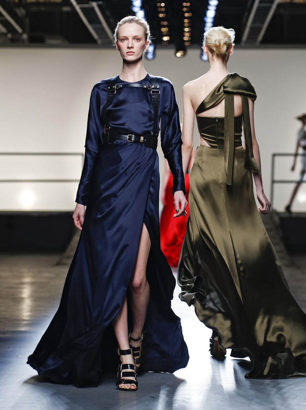 Even the draped evening gowns have a tough edge, with black leather harness details. Some have cutouts that expose a slice of the lower torso.