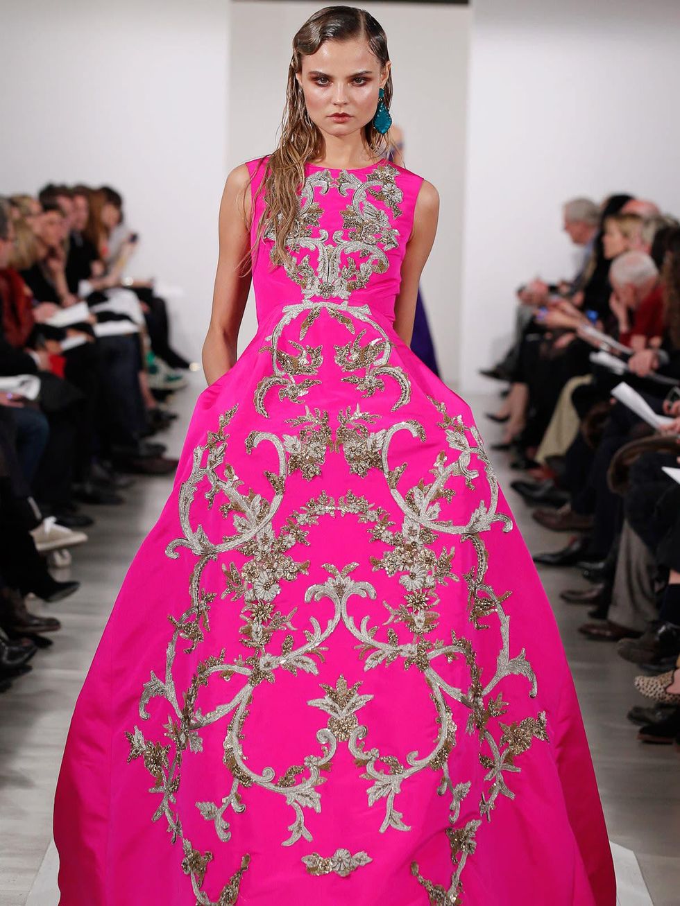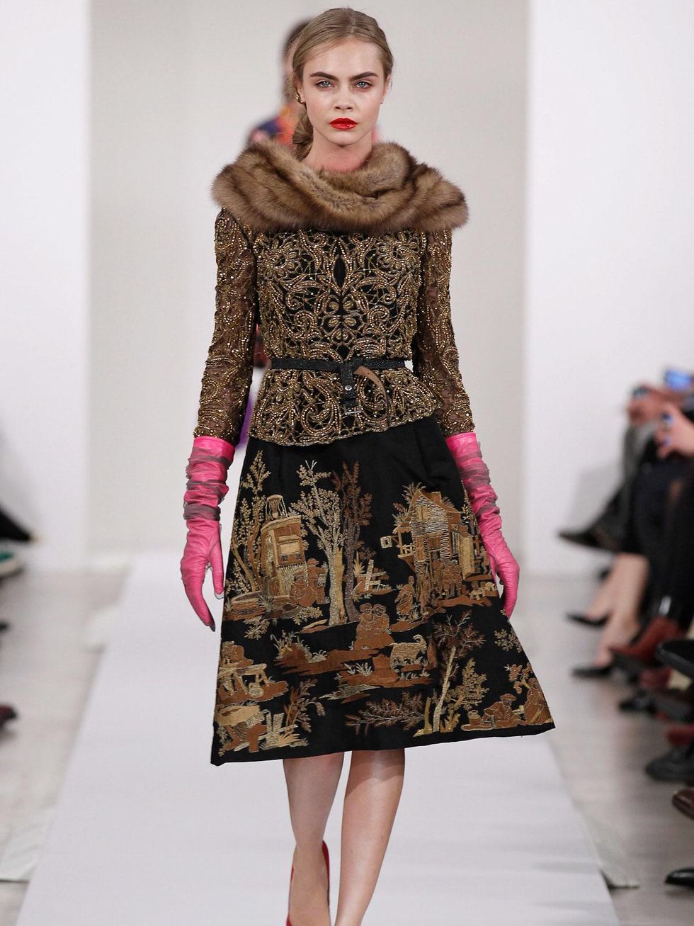 The collection — de la Renta's freshest in years — maintains the DNA of the brand, while Galliano's work at Dior shines through in the silhouettes and styling.