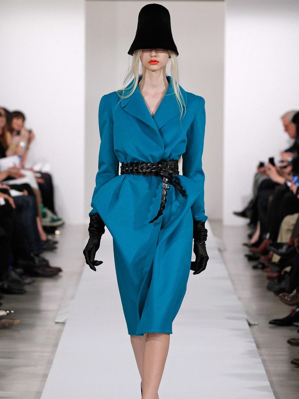 Oscar de la Renta did something different. In the first look of his sparkling show, held in his midtown Manhattan showroom Tuesday night, he made a statement with a draped coat in a shiny, rich-looking teal, padded at the shoulders and cinched at the waist with a knotted belt.