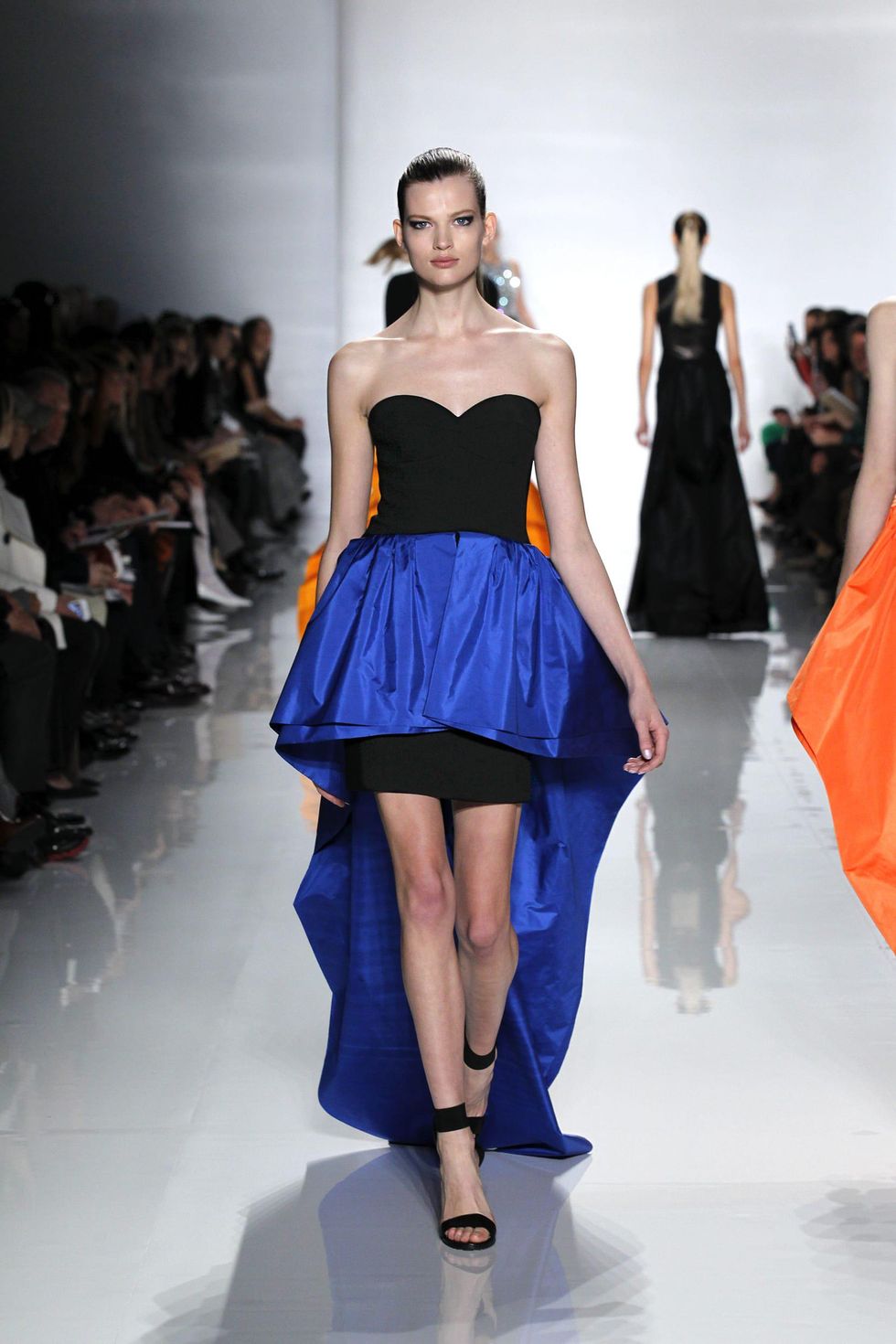 Instead of full-on evening gowns, the collection features short peplum skirts in shades of neon orange and royal blue with long trains. So what if they look a little Atlantic City-cocktail waitressy? They make a statement.