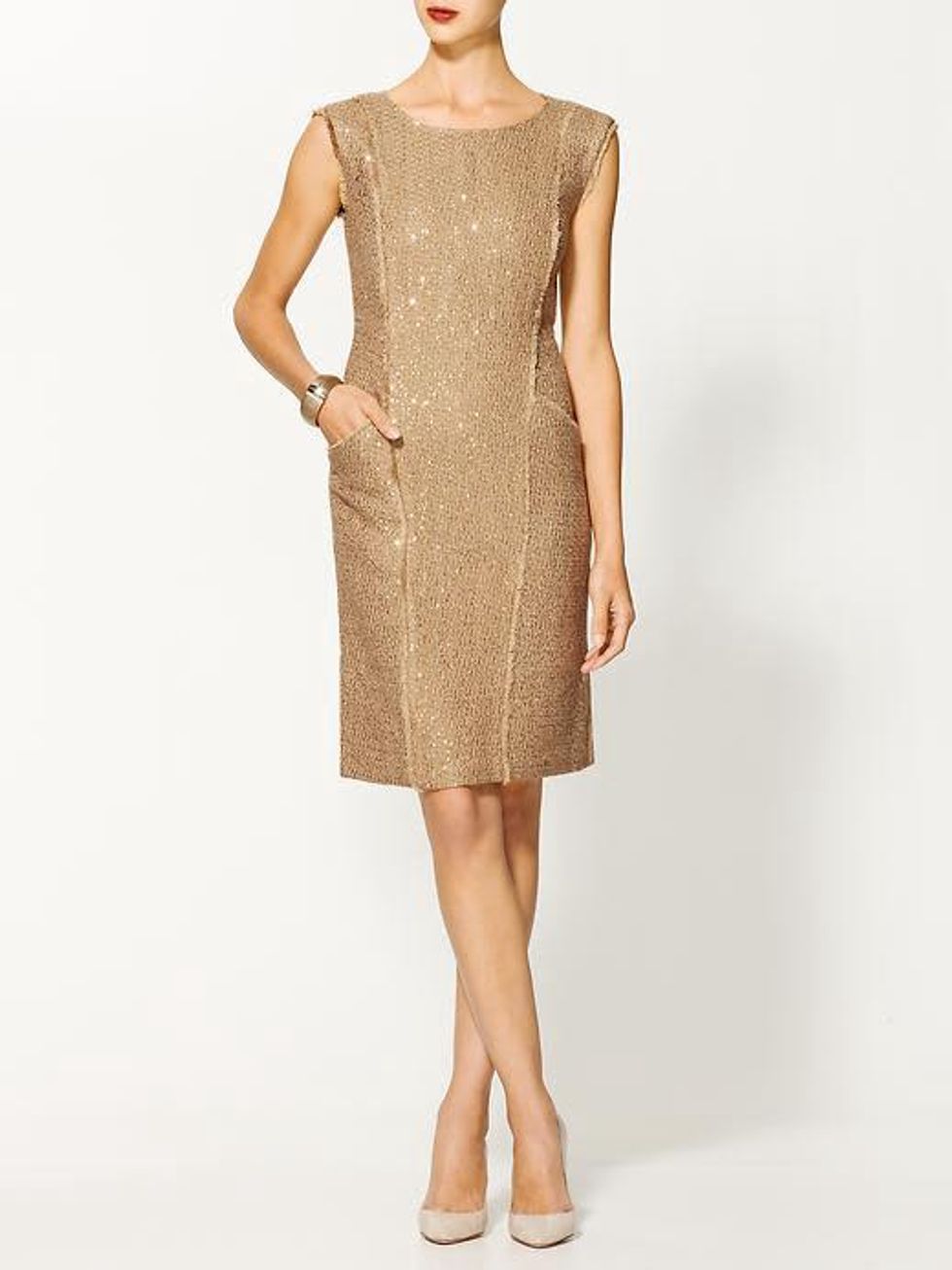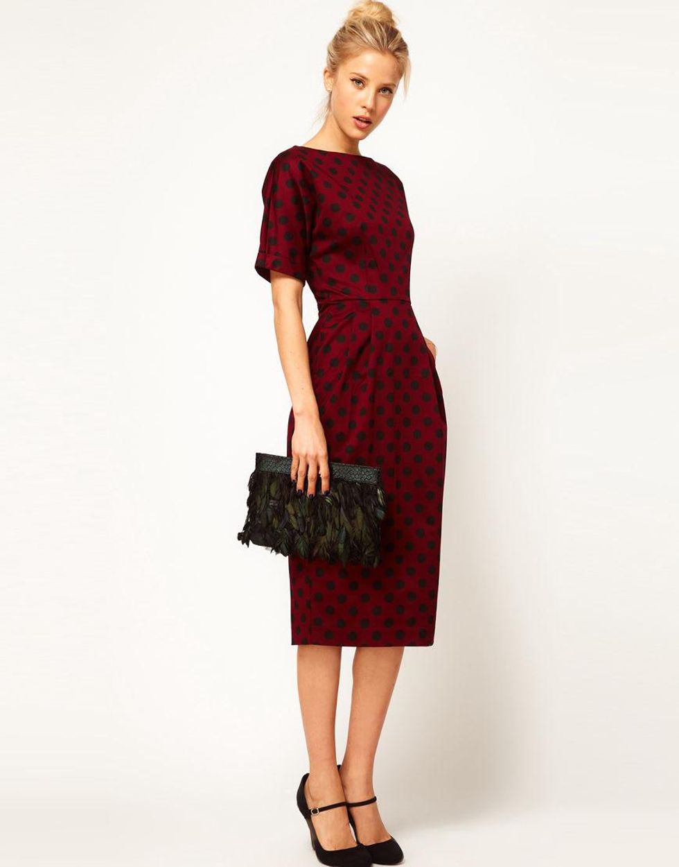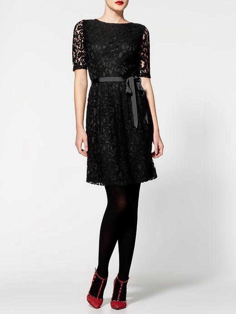 These chic, affordable and classic party dresses, chosen with a mom's body in mind, are just the ticket for the woman who doesn't want to be too trendy during the holidays. I picked dresses to suit every personality and body shape, and fabrics and details range from feminine lace and pretty pleats to rich metallics, bold color and fun patterns. No need to fight the chaos at the malls; I scoured the retailers for these Mommy Stylist [https: /mommystylist.com]-approved frocks and brought the stores to you. To keep warm — not that you need to in Dallas right now — try a black blazer over your dress [https://mommystylist.com/2012/11/26/what-to-wear-winter-holiday-gathering/]. (Mila Kunis pairs them perfectly [https://pinterest.com/pin/59883870016999681/].) Next week: trendier, but still mom-friendly, holiday looks. --- The shape of this dress makes polka dots sexy. It works on an hourglass figure, and because of the strong shoulders, it could flatter a pear shape as well. If you have a straight body, try adding a belt to define the waist. Wear it again: luncheon, business meeting