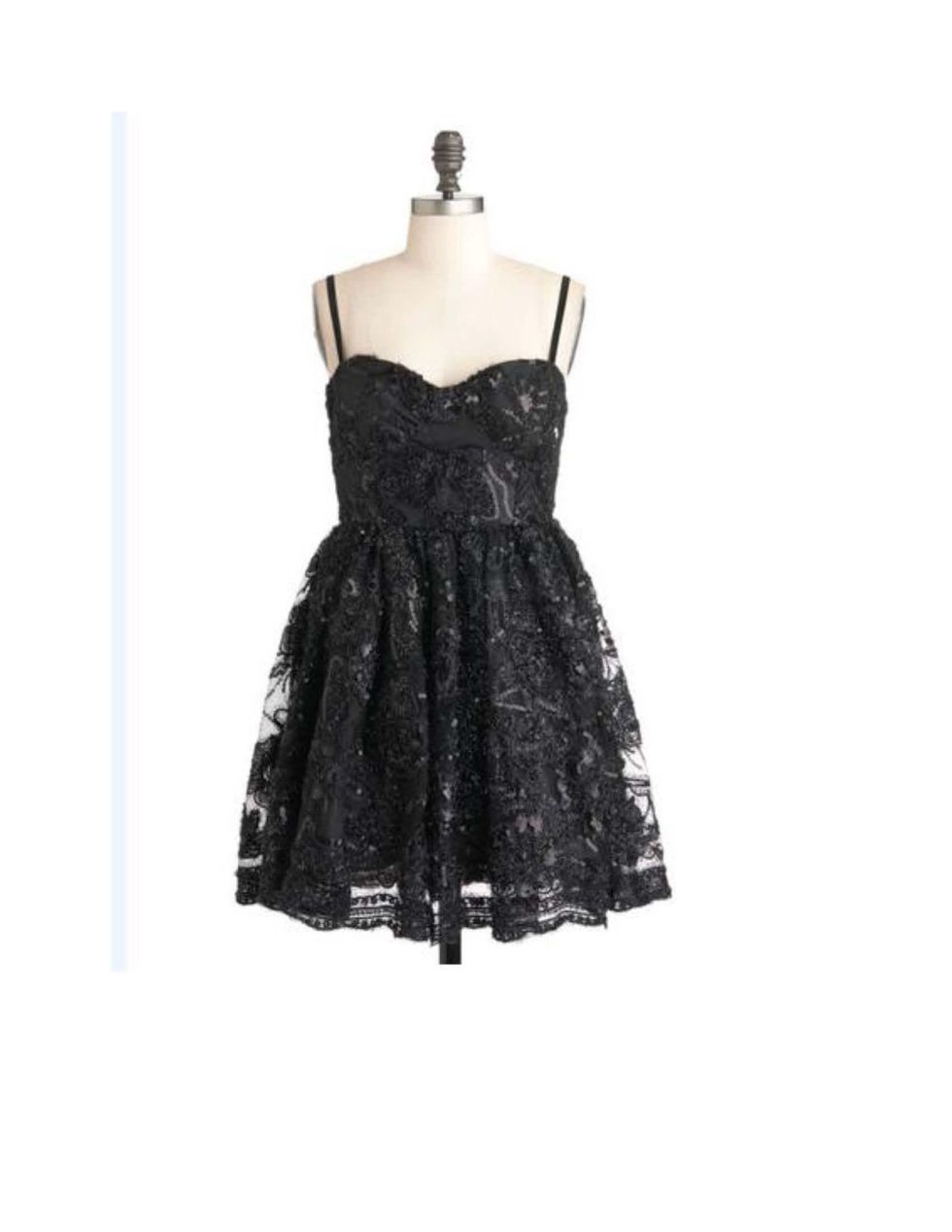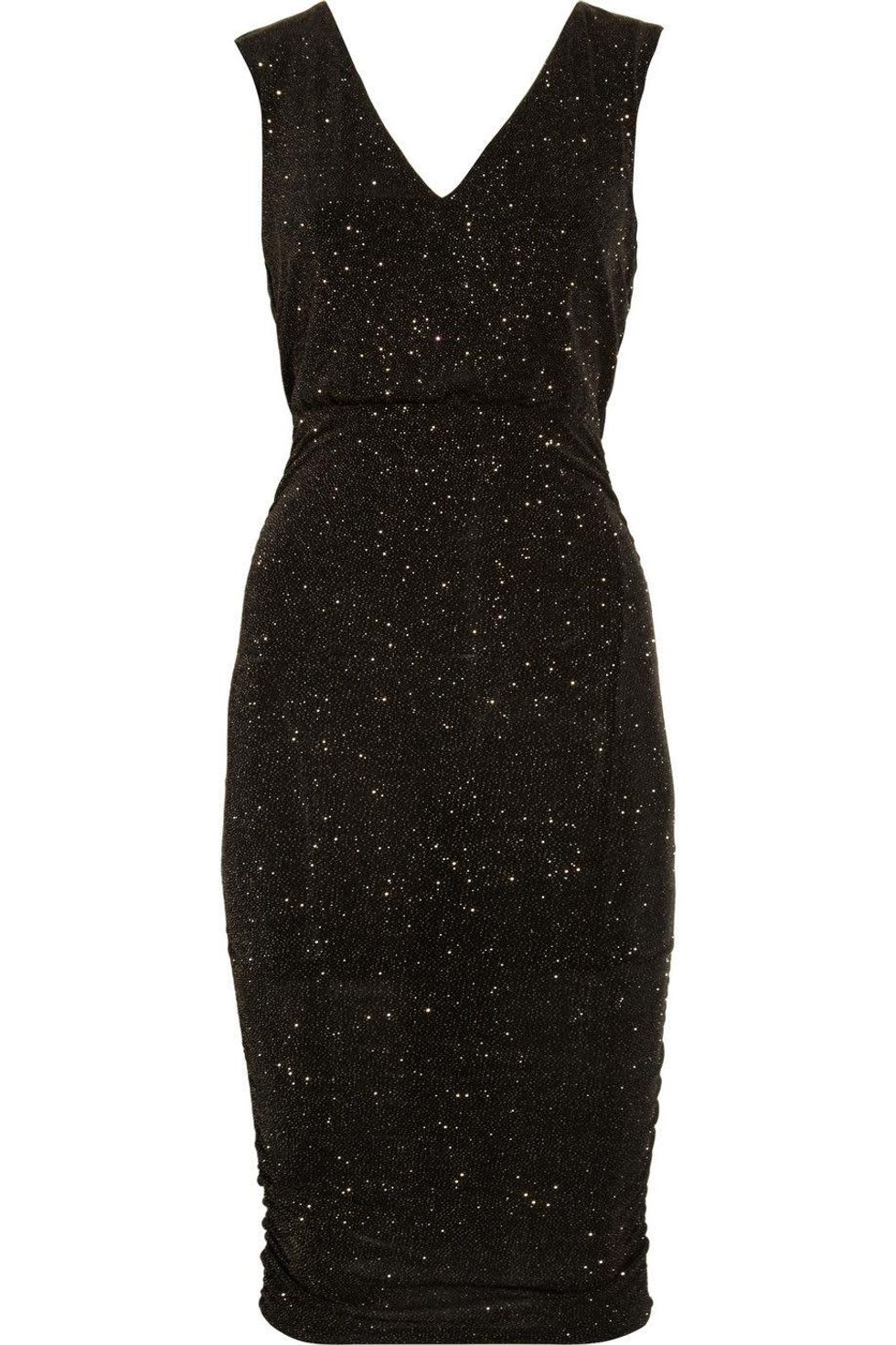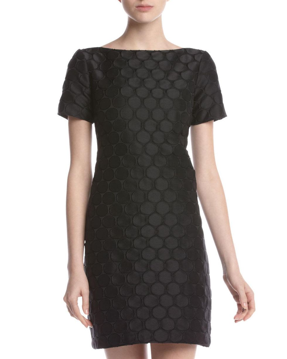 These chic, affordable and classic party dresses, chosen with a mom's body in mind, are just the ticket for the woman who doesn't want to be too trendy during the holidays. I picked dresses to suit every personality and body shape, and fabrics and details range from feminine lace and pretty pleats to rich metallics, bold color and fun patterns. No need to fight the chaos at the malls; I scoured the retailers for these Mommy Stylist [https: /mommystylist.com]-approved frocks and brought the stores to you. To keep warm — not that you need to in Dallas right now — try a black blazer over your dress [https://mommystylist.com/2012/11/26/what-to-wear-winter-holiday-gathering/]. (Mila Kunis pairs them perfectly [https://pinterest.com/pin/59883870016999681/].) Next week: trendier, but still mom-friendly, holiday looks. --- The shape of this dress makes polka dots sexy. It works on an hourglass figure, and because of the strong shoulders, it could flatter a pear shape as well. If you have a straight body, try adding a belt to define the waist. Wear it again: luncheon, business meeting