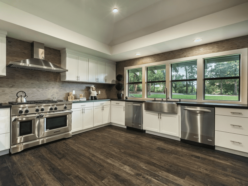 The kitchen is a chef’s dream, with hardwood floors, stainless appliances, a massive gas stove with two ovens and a stainless farmhouse sink overlooking the private lot.