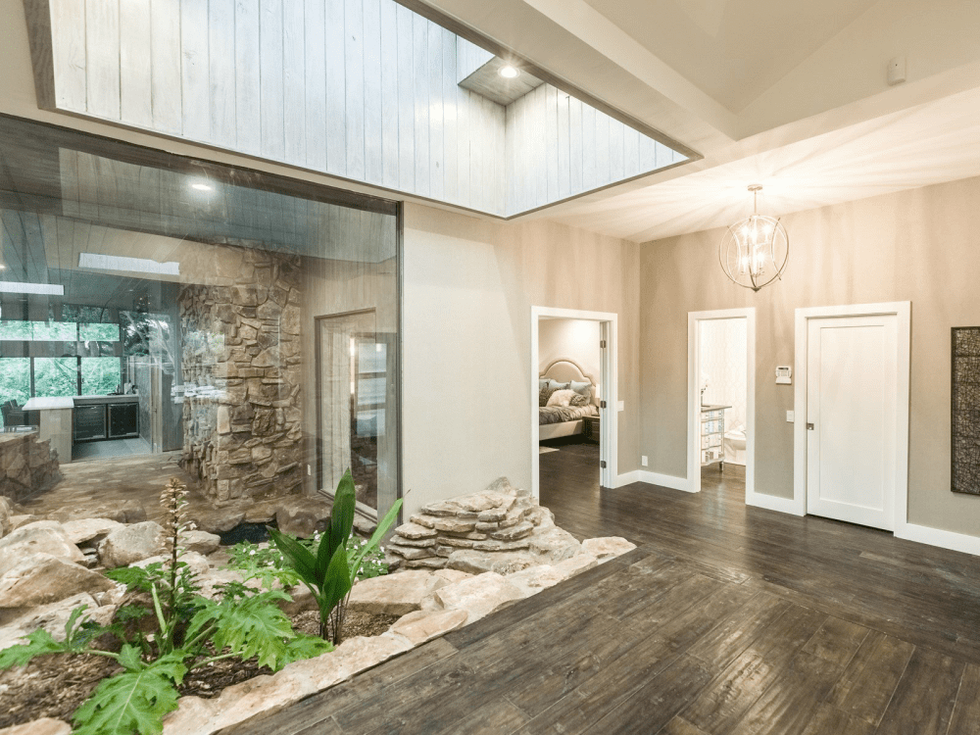 When you’re ready to dry off, the open floorplan greets you with a muted color palette, natural materials and floor-to-ceiling windows that seem to whisper relaxation. Light filters in from above, thanks to the central atrium, and vaulted ceilings in the living room give plenty of space to breathe.