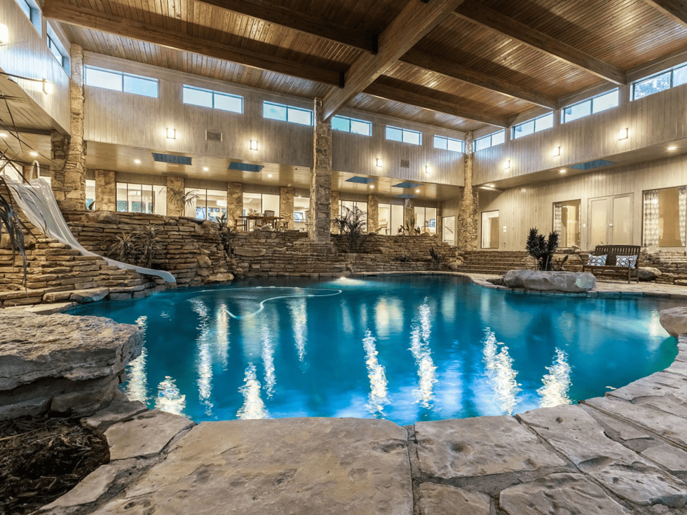 Sprawling over a whopping 9,239 square feet, the four-bedroom, six-bath home is listed with Linda Magazzine of Ebby Halliday for $1,250,000. It’s a charming home on a stunning lot, but the multiple outdoor water features have nothing on the indoor pool room.