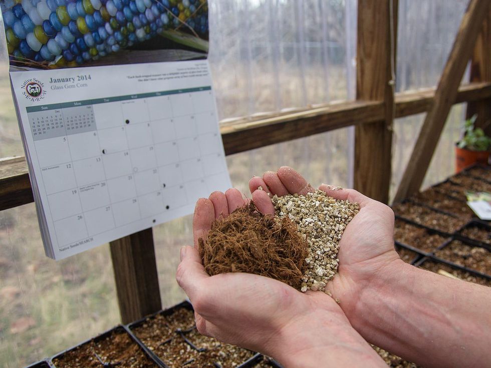 To mix these ingredients, I take a fistful of vermiculite from one bag and a fistful of coir from the other and toss them into a five-gallon bucket. I stir with a garden trowel and sprinkle in enough water to keep the blend moist but not soggy. Once my bucket is full, I dole out my mix into starter trays and place them in a spot that will get six to eight hours of sunlight a day.