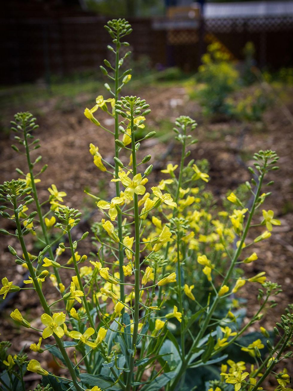 In season, the garden yields beets, cucumbers, tomatoes, potatoes and plenty of herbs. In one section, a hardy showing of garlic thrives against an arbor covered in vines. On the opposite side, kale blooms with yellow flowers, intentionally allowed to bolt so the bees and butterflies have a little early spring nourishment.