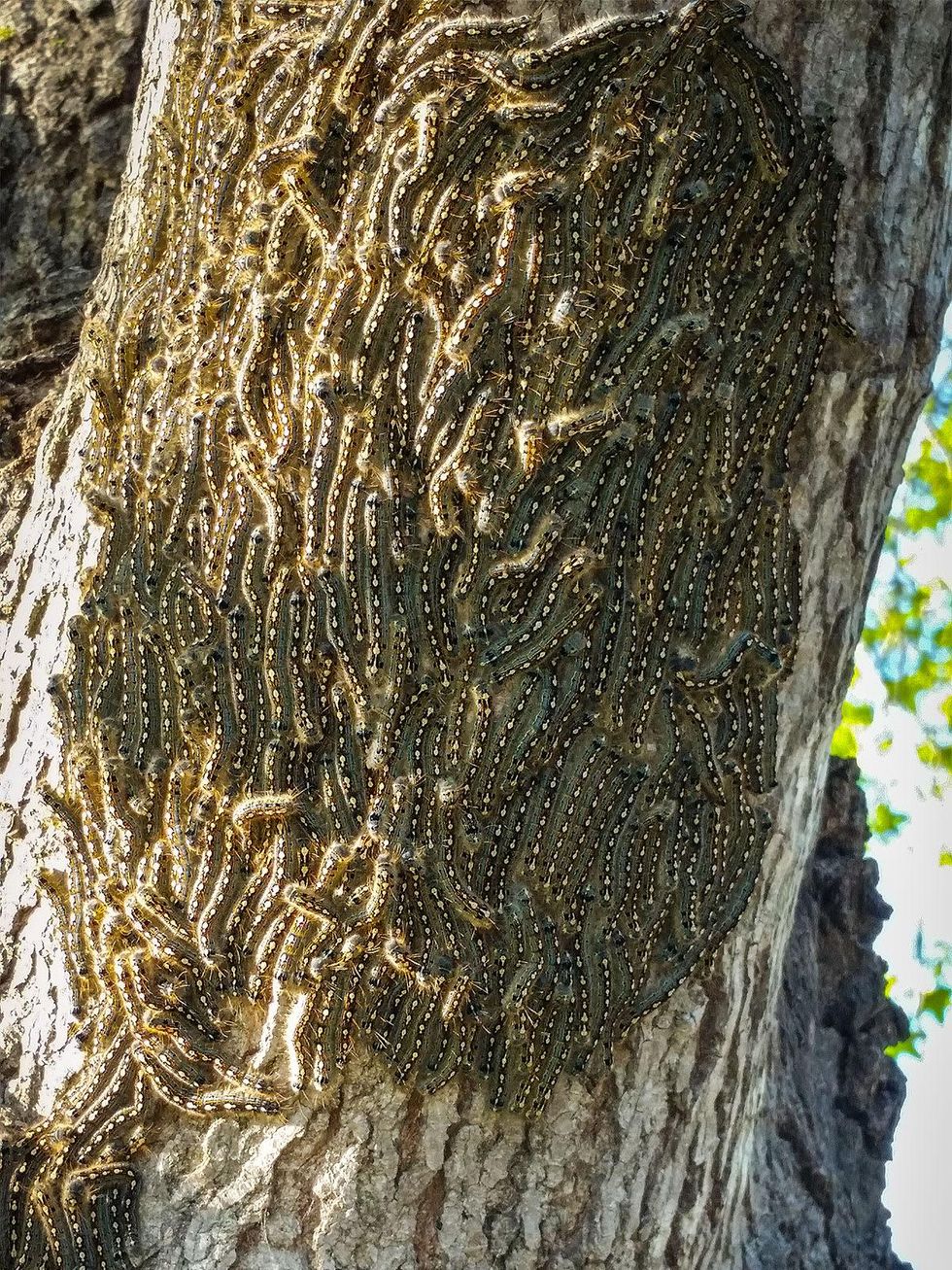 "They're very gregarious," Huckabee says. "I do not recommend spraying pesticides by any means, because they may kill other beneficial insects in the area. If you see the masses moving up the trunk, they can be removed manually since they stay together in groups. Egg masses can be removed during winter pruning to prevent more caterpillars the following spring."