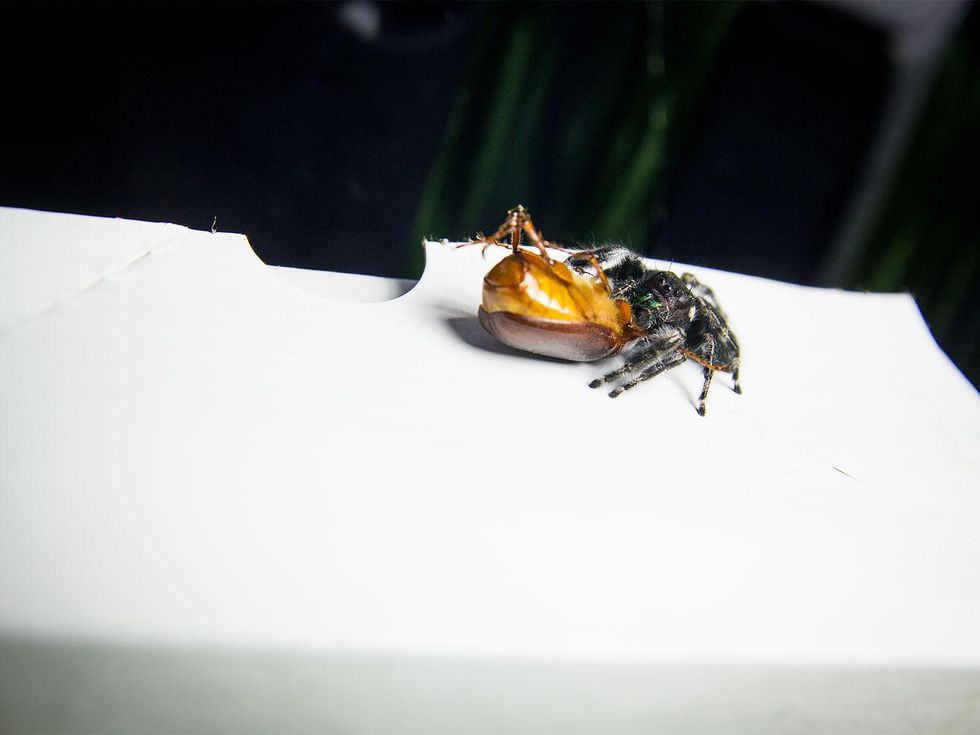 But as I picked up one June bug on top of a seed box on a shelf above my lettuce, something black hung off the back. It startled me, so I quickly let go. It was a little black jumping spider, who had made quite a catch for the night and was not about to lose it to some huge giant.
