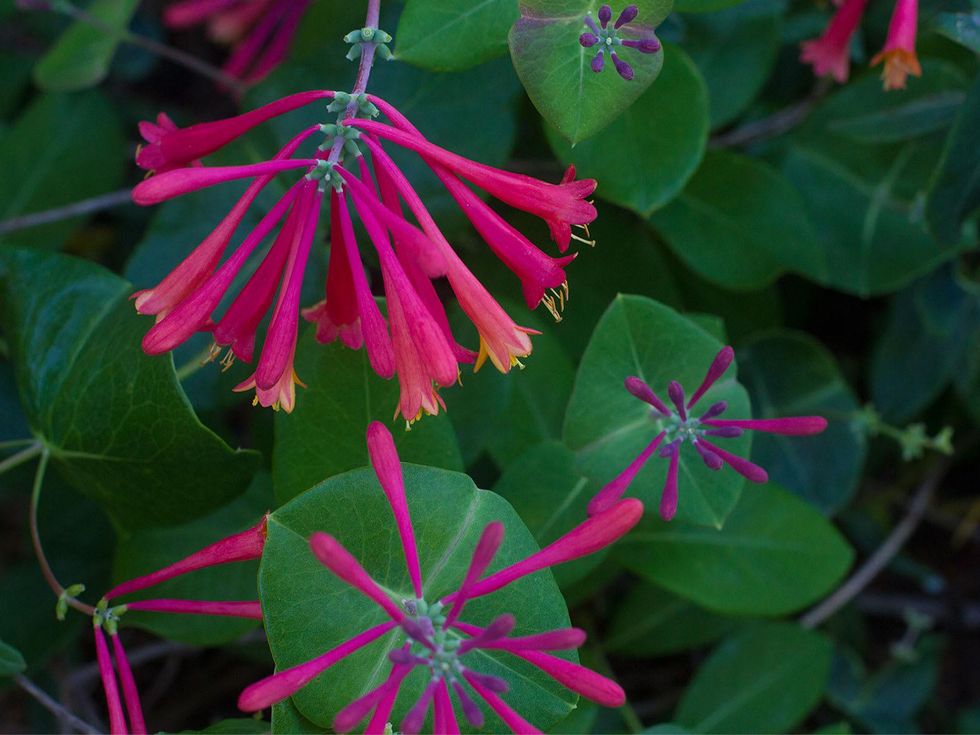 - Texas coral honeysuckle. Vibrant blooms decorate the dark green foliage of a plant that can either grow as a vine or bush. When its trumpet-shaped flowers open, it becomes a natural hummingbird feeder, without the need for a daily cleaning.