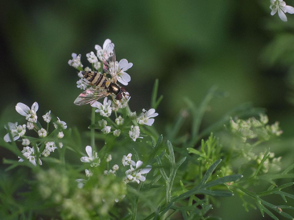 Crowding such a short-lived herb is not a problem, as the dense growth shades the soil and helps conserve moisture. Later, I can pull up all but two or three plants and let them bolt to produce even more seed. Allowing cilantro to bolt is also good for inviting pollinators into the garden; there are several species of native bees that can only harvest nectar from flowers as tiny as those of cilantro.