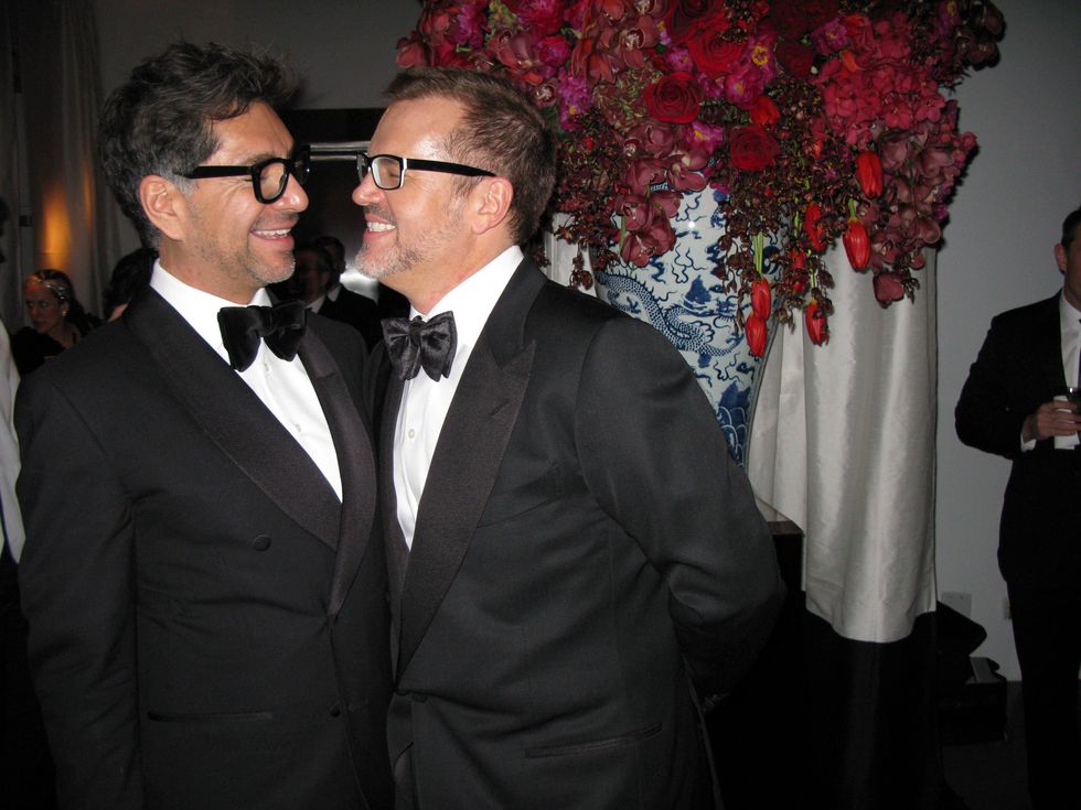 Once dinner service was completed, the wedding began with attendants, all calling themselves "bridesmaids," standing up for each of the grooms. From Dallas, Fiscus was represented by Suzanne Droese, Laura Franks, Jennifer Harris, Brooke Hortenstine, Tracy Madans, Cindy Rachofsky and DJ Lucy Wrubel. As attendants, Ceron had tapped Becca Cason Thrash, Holly Moore, Karen Mayell, Lindsey Love, Mary Beth Aspromonte and Kelli Blanton. The latter unable to attend due to the death of her father-in-law, Jack Blanton Sr.