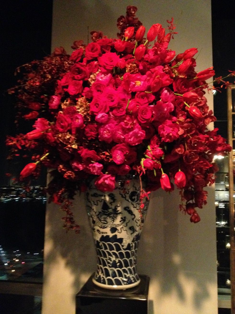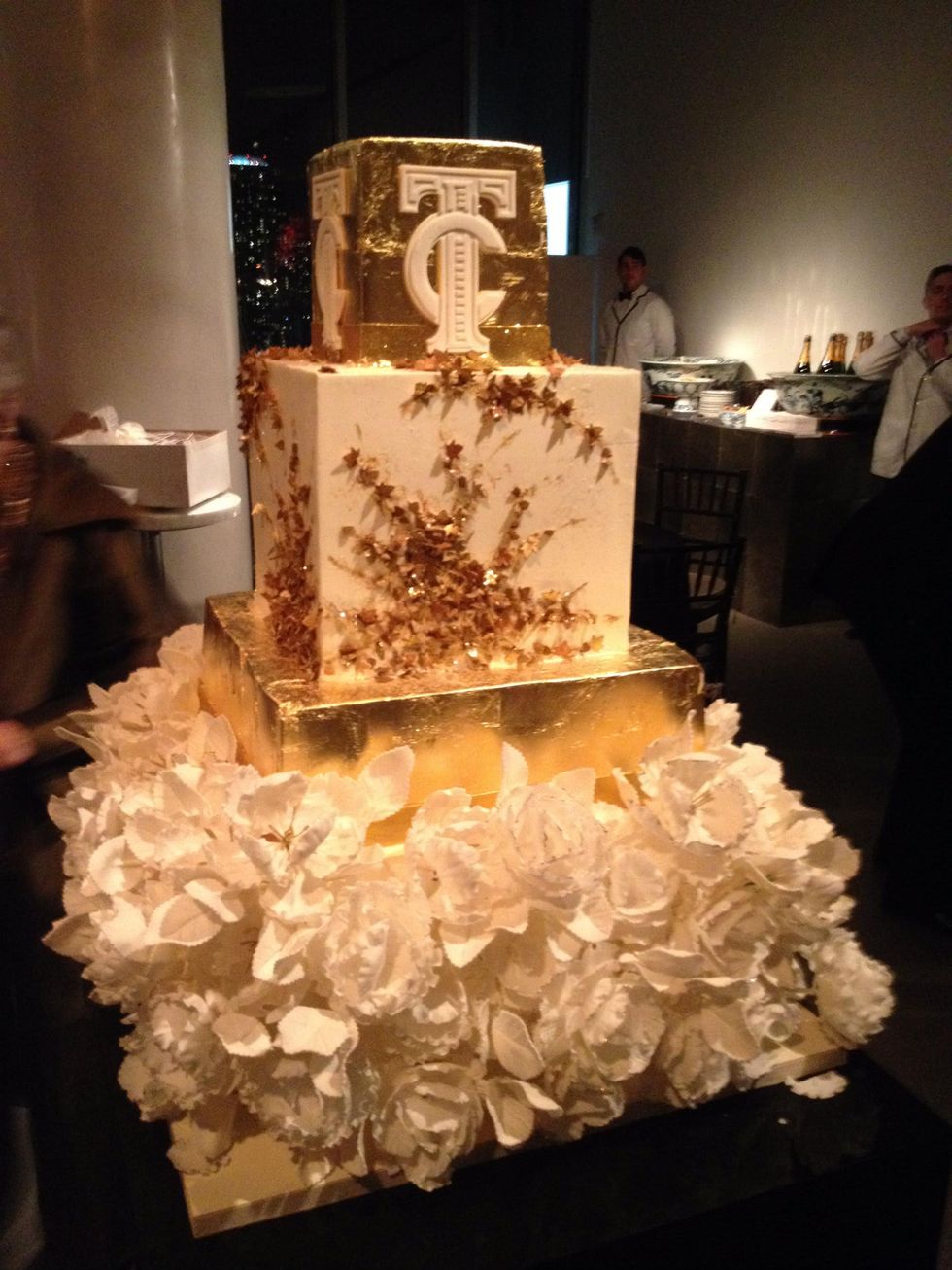 Gargantuan red-hued floral arrangements, a stunning gilded wedding cake by Sylvia Weinstock, caviar station, open bar with crystal decanters, passed hors d'oeuvre and DJ enhanced the party mood that had begun with a champagne send-off back at wedding headquarters, The Carlyle Hotel, a property of Dallas-based Rosewood.