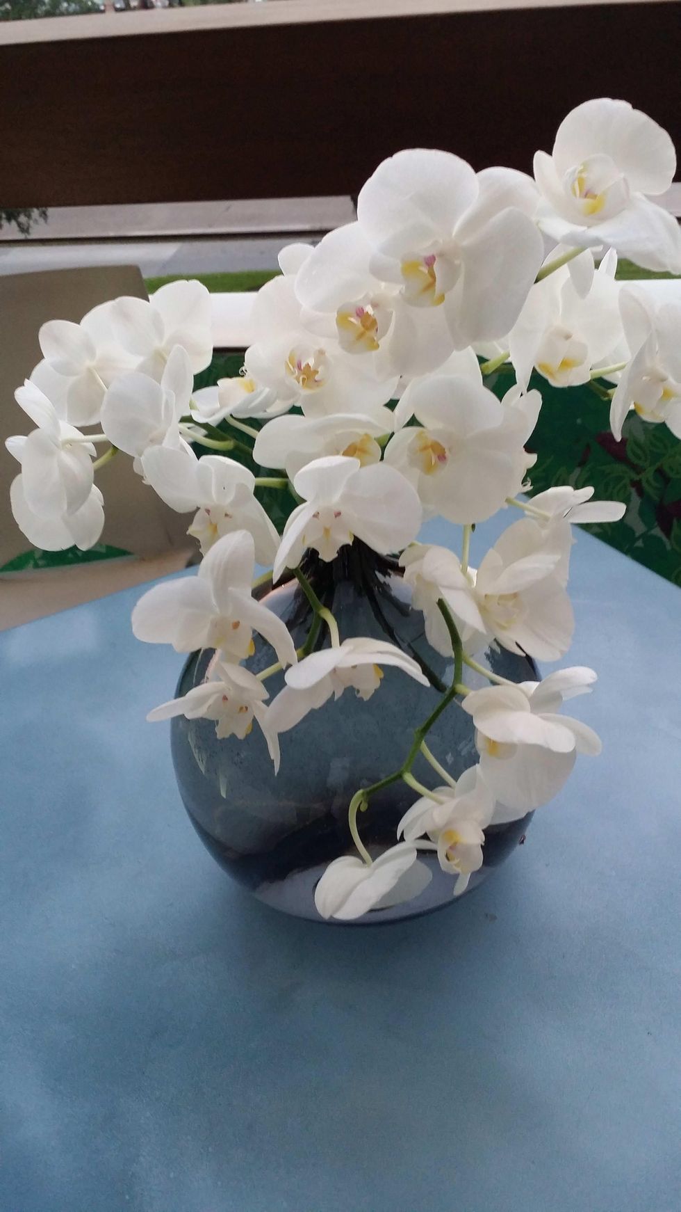 Granted, it was as hot as Hades during the early evening cocktail bash, but whirling ceiling fans and an industrial wind maker, brought in just for the party, made the outdoor experience tolerable. The open bar with beaucoup ice and the prevalent white fashions (as requested on the invitation) contributed to a sense of cool. Profusions of white orchids did their part as well in convincing the 50-plus guests that the humidity wasn't really all that bad.