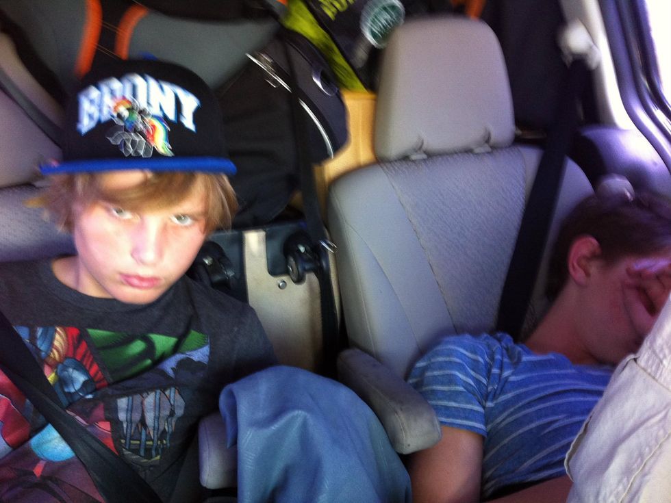 Then we have our dear offspring in the backseat. At ages 13 and 16, the boys are a gang, more often looking like they’re going to cut us instead of each other. This is new this year to the family road trip. They head butt each other to get a rise out of us instead of each other. The 16-year-old thinks he has no rules. The 13-year-old thinks he’s 16.